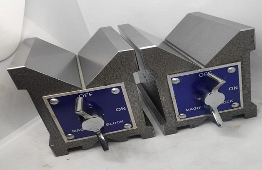 Size Matched Pair 65 x 55 x 50mm, DESCRIPTION : -Fully sealed and Solid steel made. -High and constant magnetic pull. -Holds cylindrical pieces effectively. -Protected against use of coolants. -Consists of two vees. -Supplied in single piece/matched pairs. -Easy On-Off facility PRODUCT SPECIFICATION : Designed for versatility and accuracy, these Vee Blocks are ideal for holding round or irregular shapes for scribing, grinding, measuring, machining and testing applications. All vee’s and faces can be energized or de-energised simultaneously by turning the rotary action control knob. Hence enabling it to hold itself and the work against any flat Ferrous surface. Magnetic Vee Block is an indispensable item of equipment for tool rooms and production departments. Having 3 contact faces, all magnetized at the same time, it will hold itself and will work on any flat ferrous surface. The use of coolants will not effect this Vee Block as it is fully sealed. Vee Blocks are required for quality control, tool room and standard room. These are used for grinding and drilling work and even for light milling work. It can be used on machines fitted with Magnetic Chucks, in such cases there is no need to switch ‘ON’ the chuck. It is sometimes advantageous to use two magnetic Vee Blocks at a time. For such duty, order a matched pair.